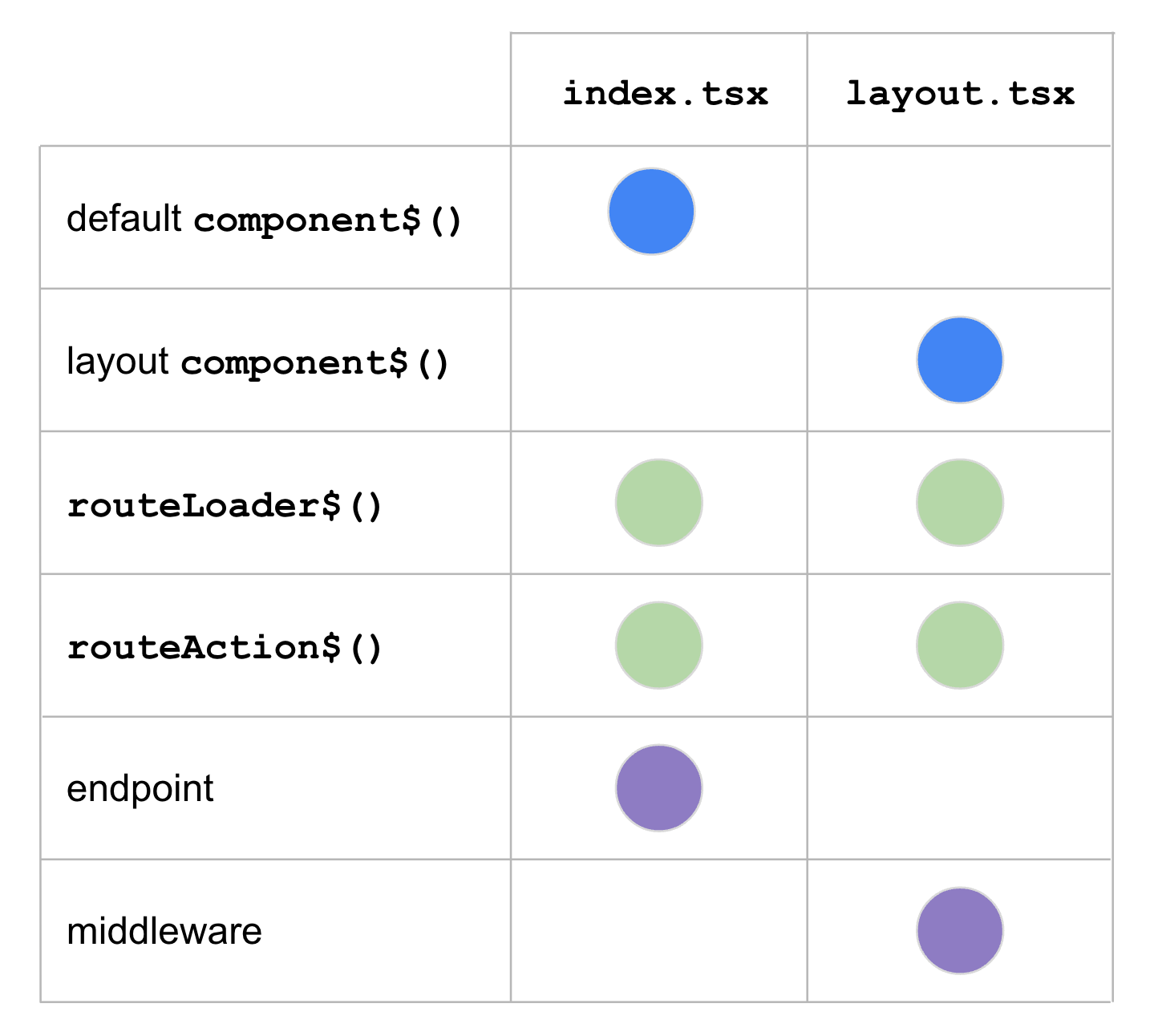 This table shows in which file (index.tsx vs layout.tsx ) should the respective feature be implemented in.